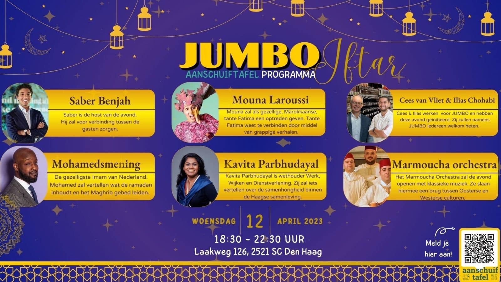 Muziek en eten verbindt mensen en kan bijdragen aan meer onderling begrip, respect, waardering en saamhorigheid. De iftar wordt door Jumbo samen met maatschappelijke partners in Den Haag georganiseerd.