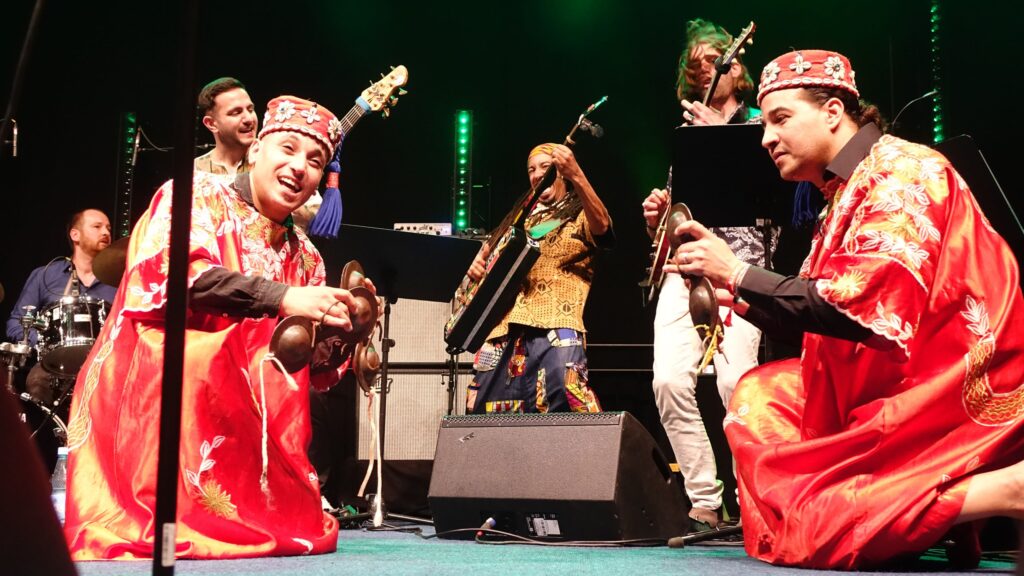 “…Het was een gigantisch feest toen het Nederlandse Marmoucha Orchestra het podium van Hal 7.1 op jazzahead veroverde. Met uitbundige klanken, die vaak gebaseerd zijn op traditionele Marokkaanse muziek, veranderde de groep, samen met hun speciale gast Mehdi Nassouli op de guembri—een driesnarige luit met een leren klankkast—de zaal in een danspaleis. Hun programma, getiteld “Sonic Bridges”, werd gepresenteerd als onderdeel van de rol van Nederland als partnerland, en ze hebben werkelijk muzikale bruggen gebouwd. De muziek was een onophoudelijk vuurwerk: intens, luid en meeslepend…”